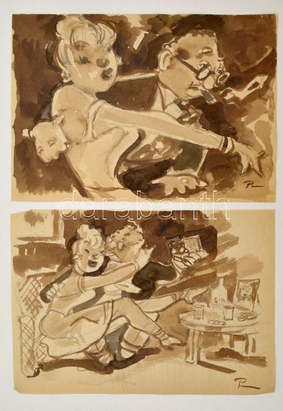 Leírás: Pán Artúr (1894-?) : Flört. Lavírozott tus ( 2 db), papír, jelzett, 29×41 cm (2×)