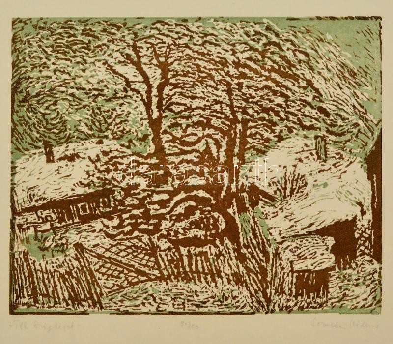 Leírás: Somlai Vilma (1938-2007): Téli Szigliget, színes linó, papír, jelzett, 20×22 cm