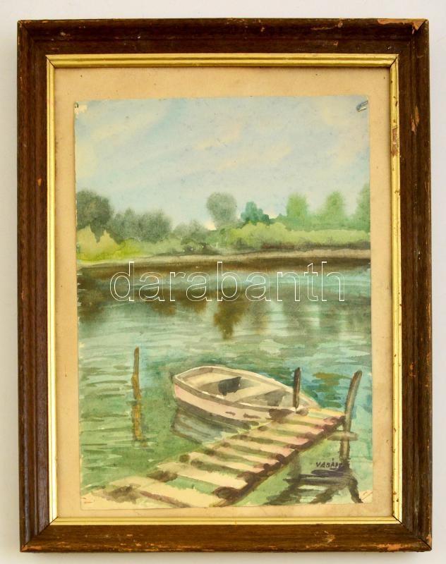 Leírás: Vadász jelzéssel: Kikötött csónak. Akvarell, papír, üvegezett keretben, 32×24 cm