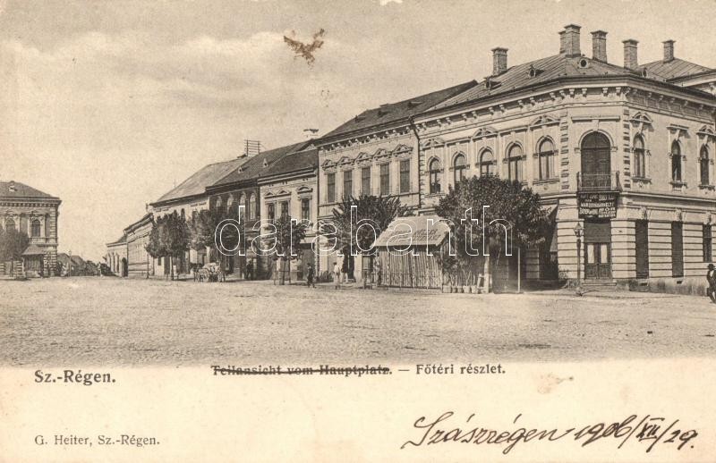 Leírás: 1906 Szászrégen, Reghin; Fő tér, Arnold Müller cukrászdája, üzletek. Kiadja G. Heiter / main square, confectionery, pastry shop, shops
