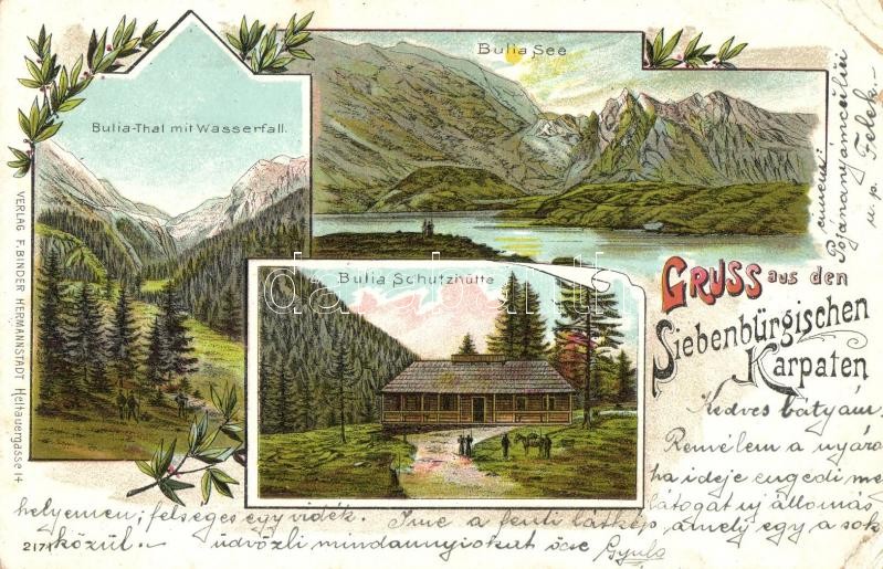 1909 Bólya, Bell, Bulia, Buia; Grüss aus den Siebenbürgischen Karpaten! Bulia-Thal mit Wasserfall, Bulia-See, Bulia-Schutzhütte / Üdvözlet az Erdélyi Kárpátokból! völgy és vÃzesés, menház, tó. F. Binder kiadása / Greetings form the Transylvanian Carpathians! valley, waterfall, chalet, tourist house, rest house, lake. Art Nouveau, floral, litho (r)