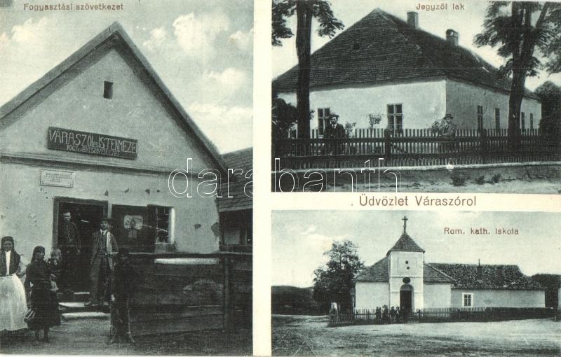 Leírás: Váraszó, Római katolikus iskola, Jegyzői lak, Váraszói és Istenmezei fogyasztási szövetkezet üzlete és saját kiadása