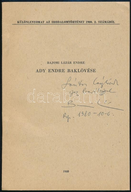 2 dedikált különlenyomat: Bajomi Lázár Endre: Ady endre baklövése. 198... https://www.darabanth.com/hu/336-Gyorsarveres/336.0/Konyvek/Konyvek-Egyeb-ritkasagok~2000018/2-dedikalt-kulonlenyomat-Bajomi-Lazar-Endre-Ady-endre-baklovese-1980-5p-Eosze-Laszlo~II1867083
