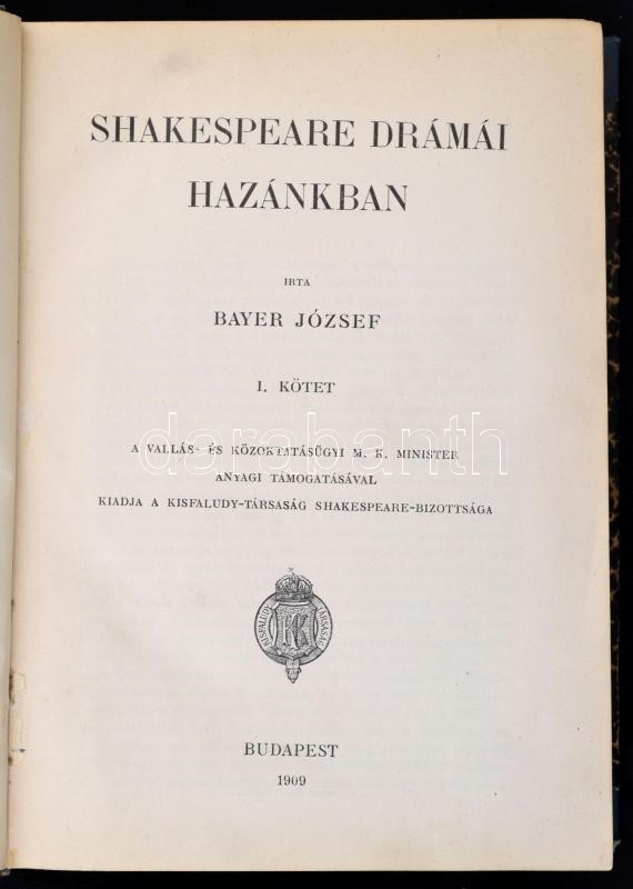 Bayer József: Shakespeare drámái hazánkban. I-II. kötet. (Egybekötve.) Bp.,1909, Kisfaludy-Társaság,(Franklin-Társulat-ny.), XVI+746+XII+385 p. Későbbi átkötött félvászon-kötés, a gerincén hiányos címkével, kissé kopott borítóval, jó állapotban. Egyetlen kiadás.