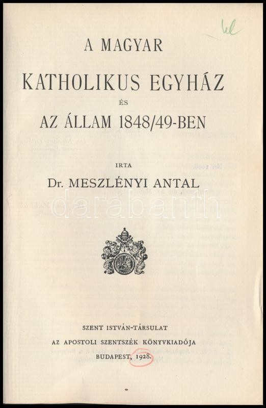 Dr. Meszlényi Antal: A magyar katholikus egyház és az állam 1848/49-ben. Szent István Könyvek 58. Bp, 1928, Szent István-Társulat. Kiadói papírborítóban, a hátsó kötéstábla sérült, kissé hiányos.