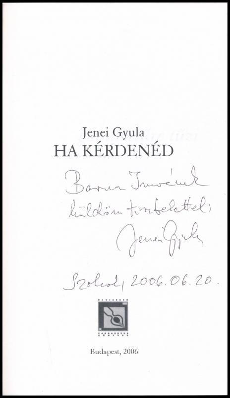 Jenei Gyula: Ha kérdenéd. Parnasszus Könyvek. Új Vízek. XXVI. Bp.,2006, Tipp Cult. Kiadói papírkötés. A szerző, Jenei Gyula (1962-) által Barna Imre (1951-) József Attila-díjas magyar műfordító, kritikus, Európa Kiadó (2008-2013) igazgatójának, Magyar Könyvkiadók és Könyvterjesztők Egyesületének elnökének részére dedikált példány.