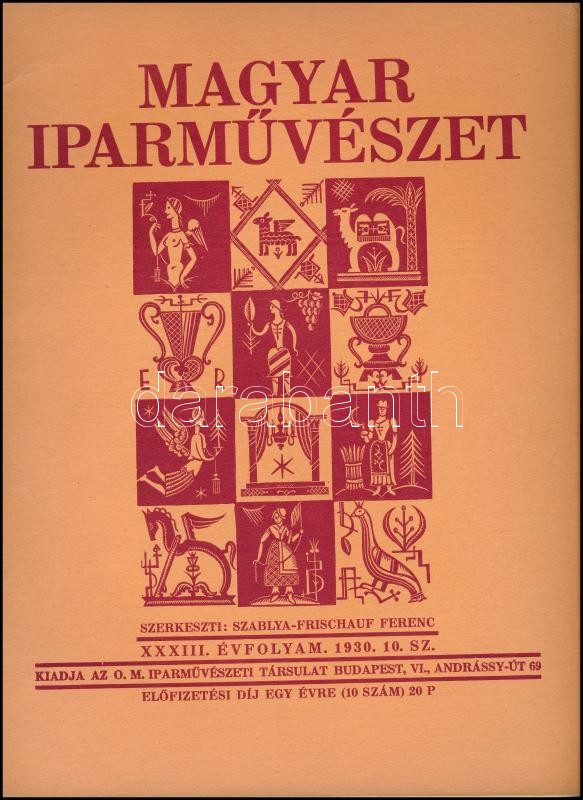 1930 Magyar Iparművészet. Szerk.: Szablya-Frischauf Ferenc. XXXII. évf. 1930. 10. sz. Bp., Országos Magyar Iparművészeti Társulat, 4+217-264 p. Kiadói papírkötés, a borítón szakadással. A magyar fametszetről szóló tematikus szám: Rosner Károly: A magyar fametszet két évtizede. Gazdag képanyaggal, számos fametszettel illusztrált. Közte: Kozma Lajos, Molnár C. Pál, Fáy Dezső, Végh Gusztáv, Kolozsvári Sándor, Divéky József, Jaschik Álmos, Gara Arnold, Kaesz Gyula, Dallos Hanna...stb. Ritka!