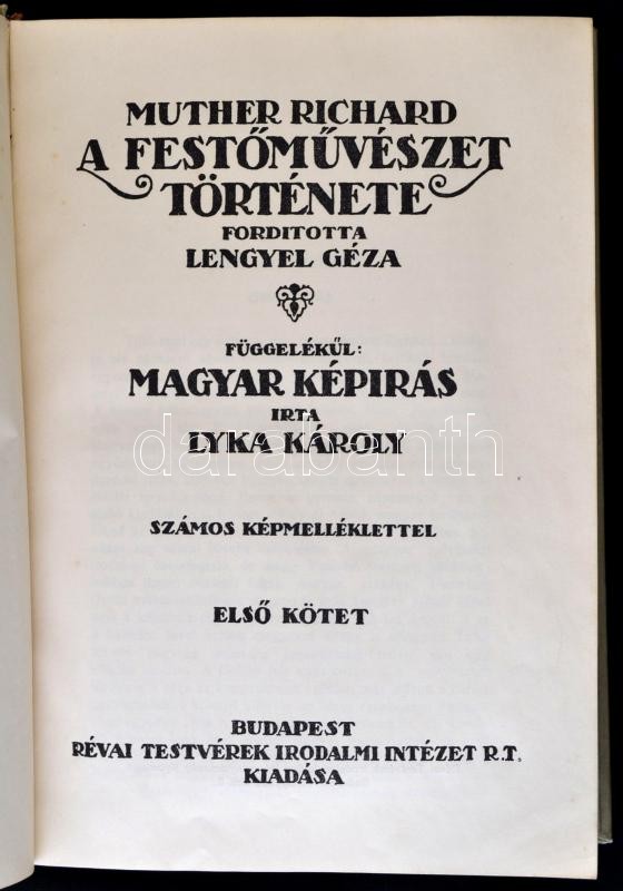 Muther Richard: A festÅ‘művészet története. I-II. kötet. (Egyben.) FordÃtotta Lengyel Géza. Függelék: Lyka Károly: Magyar képÃrás. Bp., é.n., Révai, 288+272 p. Kiadói kissé kopott egészvászon-kötésben, jó állapotban.