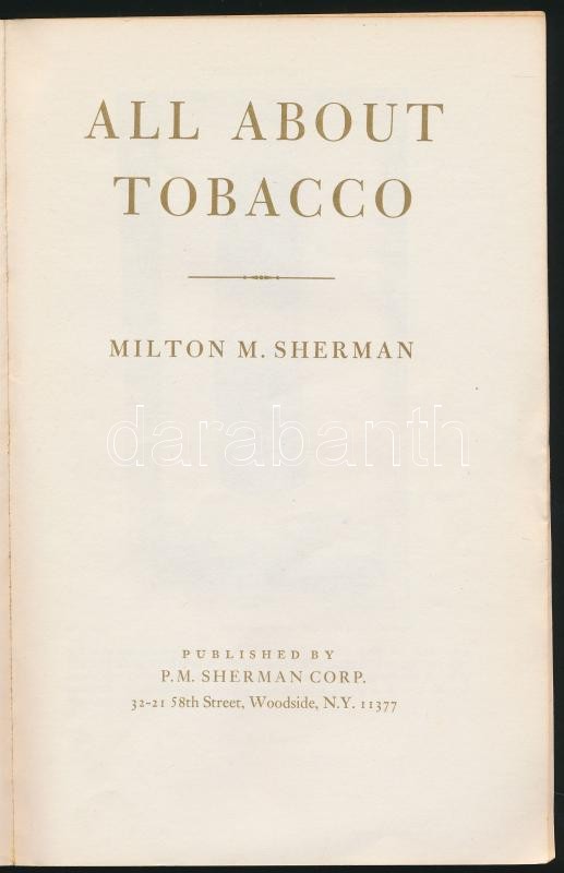 Milton M. Sherman: All about Tobacco. Woodside, 1970, P. M. Sherman Co... https://www.darabanth.com/hu/336-Gyorsarveres/336.0/Konyvek/Konyvek-Idegen-nyelvu-konyvek~2000015/Milton-M-Sherman-All-about-Tobacco-Woodside-1970-P-M-Sherman-Corp-Angol-nyelven-Kiadoi-pap~II1886949