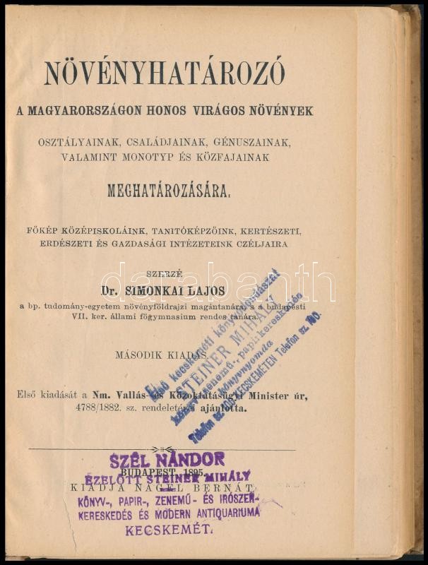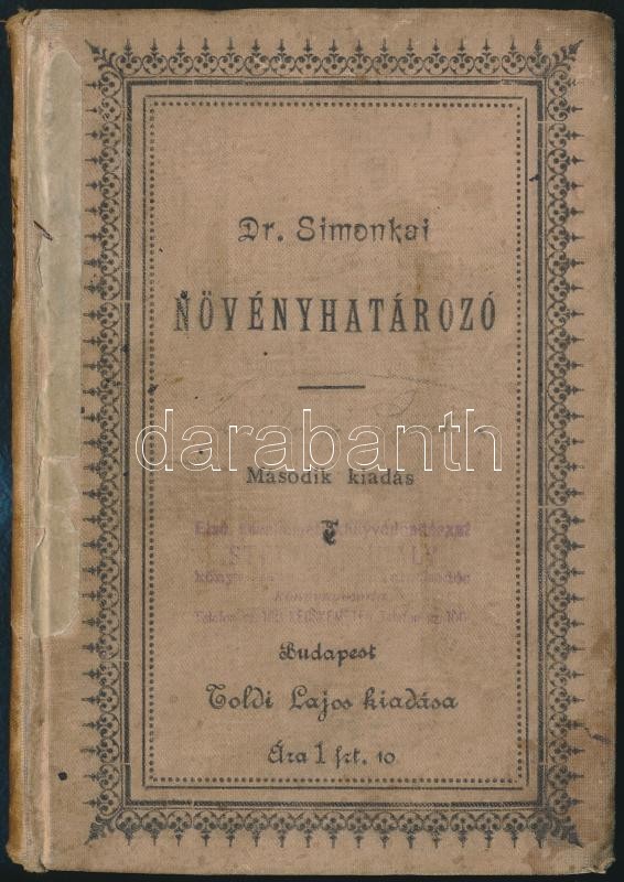 Dr. Simonkai Lajos: Növényhatározó a Magyarországon honos virágos növények osztályainak, családjainak, génuszainak, valamint monotyp és közfajainak meghatározására. Bp.,1895, Nágel Bernát, VIII+189 p. Második kiadás. Kiadói egészvászon-kötés, Kiss Valdemár-kötés, foltos, kopott borítóval, javított, sérült gerinccel, egy kijáró lappal, ceruzás jegyzettel.