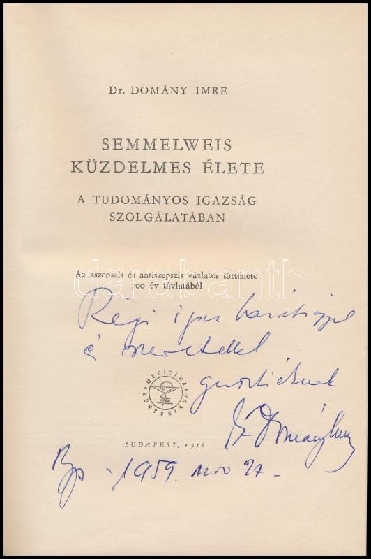 Leírás: Dr. Domány Imre: Semmelweis küzdelmes élete. Bp.,1958, Medicina. Kiadói félvászon-kötés, kopottas borítóval. A szerző által dedikált.