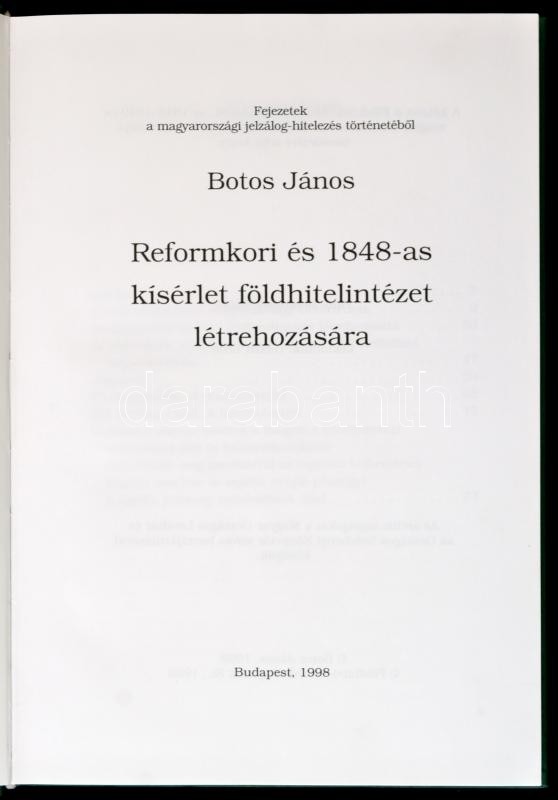 Botos János: Reformkori és 1848-as kísérlet földhitelintézet létrehozására. Fejezetek a magyarországi jelzálog-hitelezés történetéből. Bp., 1998, Földhitel- és Jelzálogbank Rt. Kiadói egészvászon kötés, jó állapotban.