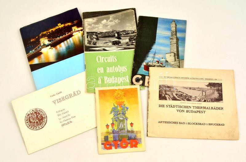 1911-1989 Vegyes úti könyv és prospektus tétel, 6 db: 1911 Die Städtischen Thermalbäder von Budapest. Bp.,1911, Druckerei der Haupt- u. Residenzstadt.,cca 1935 Győr. Bp., Pallas Nyomda.,1936 Genua. Olasz nyelvű úti prospektus, 1960 Circuits en autobus á Budapest, 1970 Fővárosunk Budapest, 1989Cseke László: Visegrád. Változó állapotban, az egyik borítója hiányzik és középen hajtásnyommal.