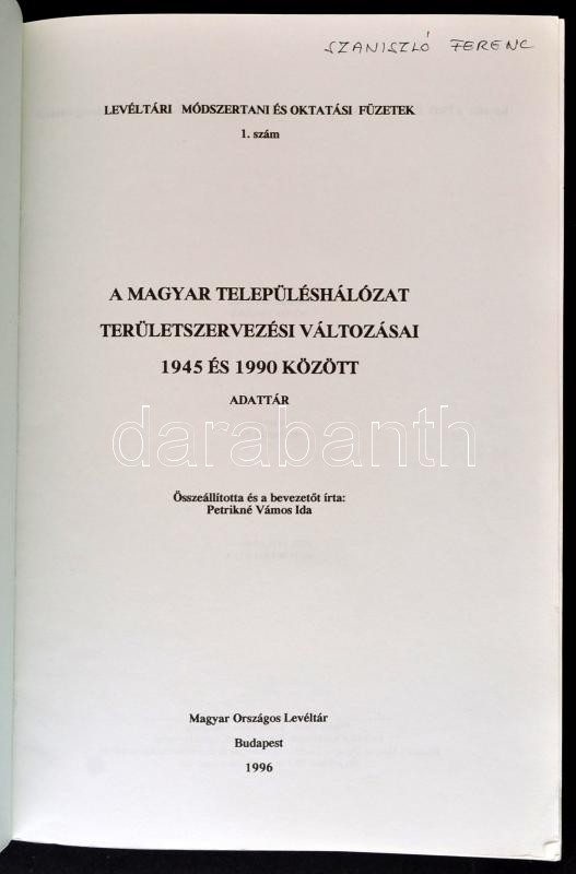A magyar településhálózat területszervezési változásai 1945 és 1990 között. Összeállította és bevezetőt írta: Petrikné Vámos Ida. Levéltári módszertani és oktatási füzetek 1. szám. Bp.,1996, Magyar Országos Levéltár. Kiadói papírkötés. Megjelent 400 példányban.