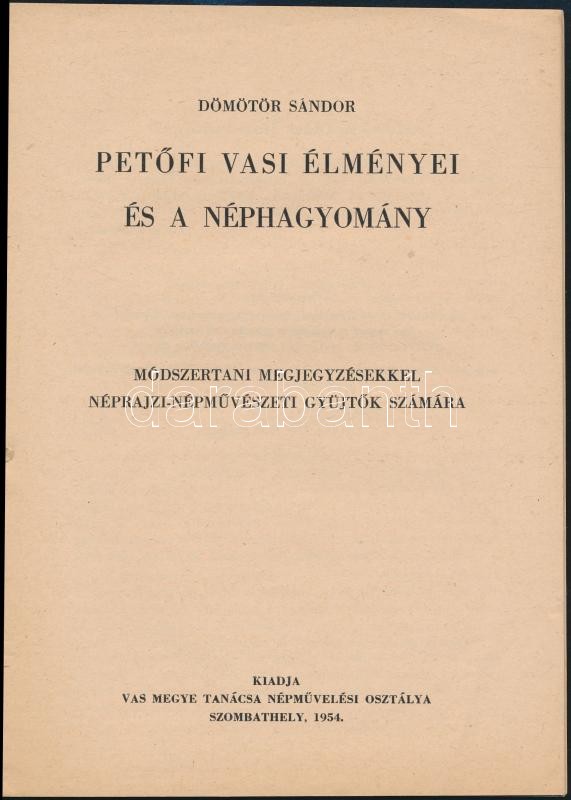 Leírás: Dömötör Sándor: Petőfi vasi élményei és a néphagyomány. Szombathely, 1954, Vas Megye Tanácsa Népművelési Osztálya, 22+2 p. Kiadói papírkötés.