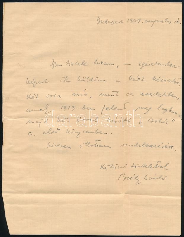 1939 Bródy László (1897-1984) saját kezű sorai és aláírása egy levélen... https://www.darabanth.com/hu/336-Gyorsarveres/336.0/Mutargy-papirregiseg-egyeb/Alairas~500019/1939-Brody-Laszlo-1897-1984-sajat-kezu-sorai-es-alairasa-egy-levelen-az-eredeti-hiany~II1846703