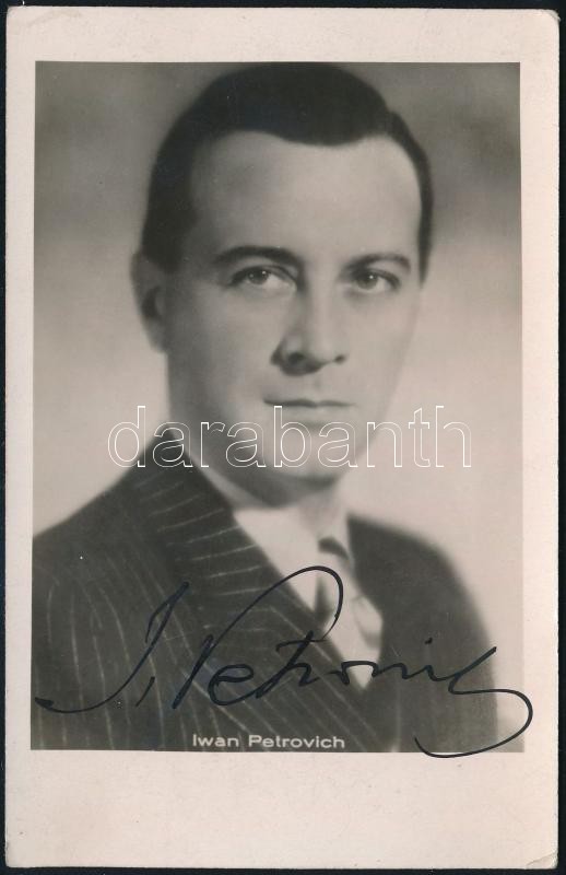 Iván Petrovich (1894-1962) filmszínész és énekes aláírt fotója, 14x9 c... https://www.darabanth.com/hu/336-Gyorsarveres/336.0/Mutargy-papirregiseg-egyeb/Alairas~500019/Ivan-Petrovich-1894-1962-filmszinesz-es-enekes-alairt-fotoja-14x9-cm~II1888200