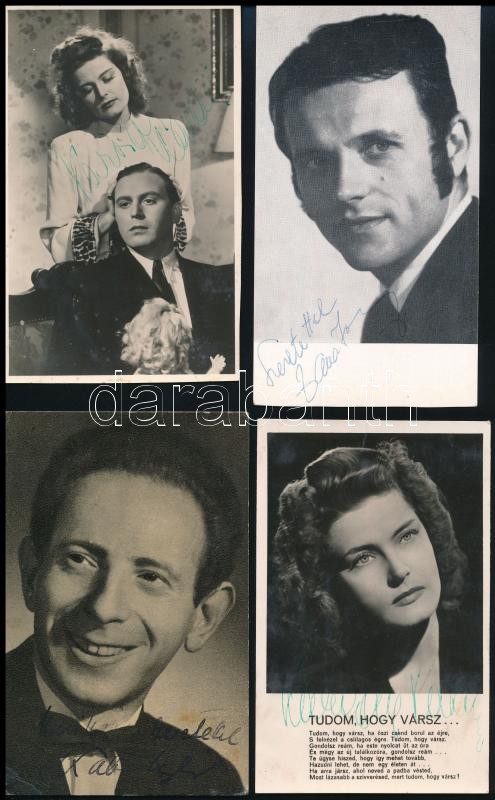 Leírás: Magyar színészek aláírása az őket ábrázoló képeken (Karády Katalin 2×, Kabos László, stb.), 4 db