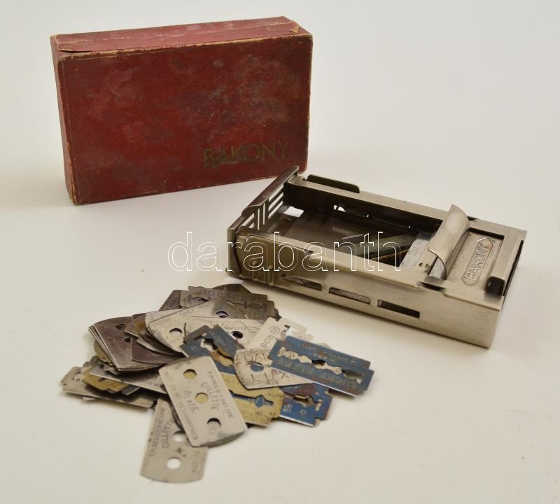 Leírás: Bakony fém borotvaélező, pengékkel, eredeti dobozában, 8×12 cm