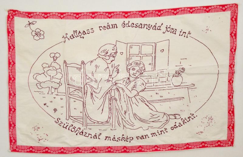 Leírás: "Halgass rám édesanyád jóra int, szülőháznál másképp van mint odakint" hímzett konyhai falvédő 75x50 cm
