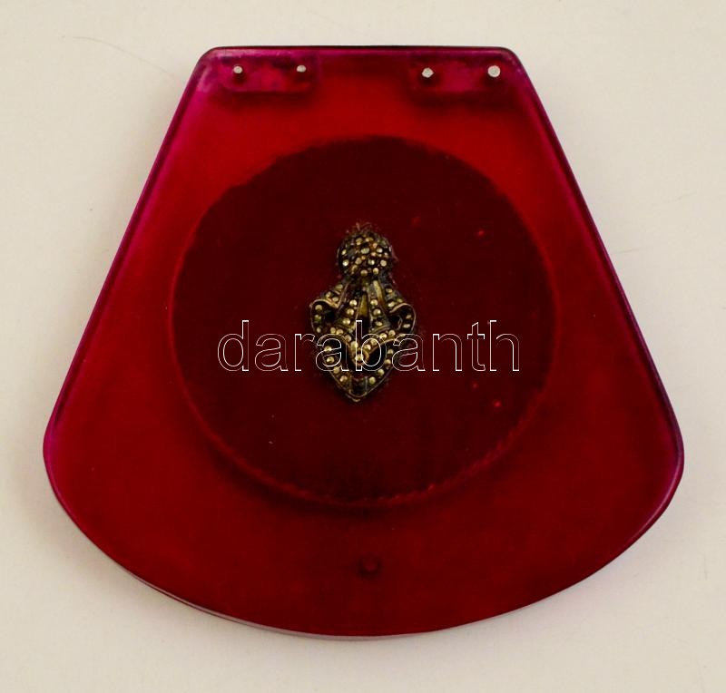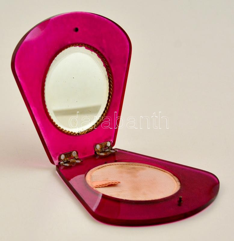Leírás: Műanyag púdertartó, tükörrel, utólag ráragasztott markazitos díszítéssel, 10×9,5 cm
