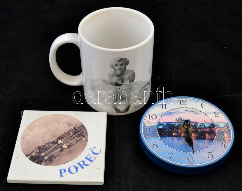 Leírás: Vegyes szuvenír tétel: Marilyn Monroe bögre, Ceská republika óra, Porec fali dísz