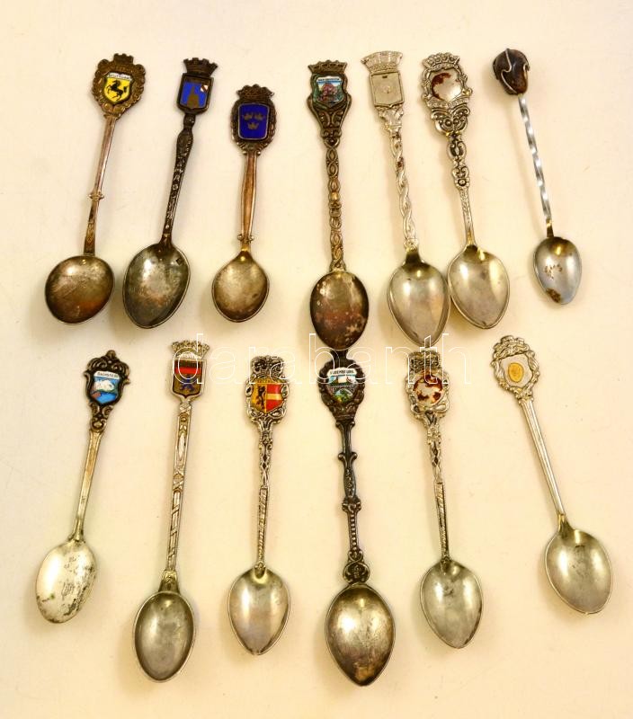 Leírás: Zománcfestett városos kanalak, benne ezüstök is