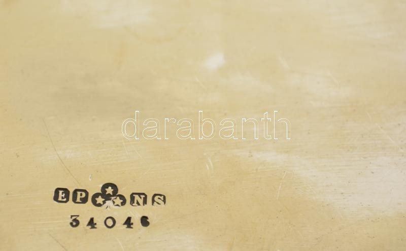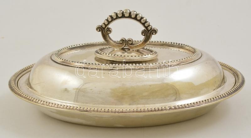 Leírás: cca 1900 jelzett angol ételszerírozó, ezüstözött alpakka, kopott, 26×20 cm