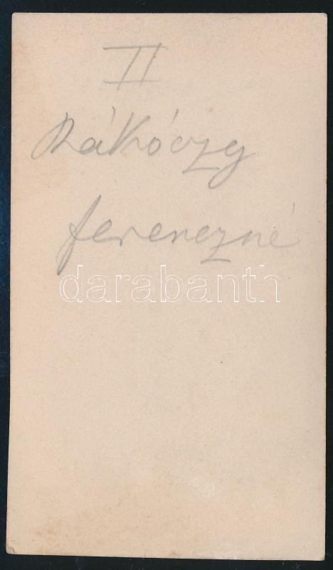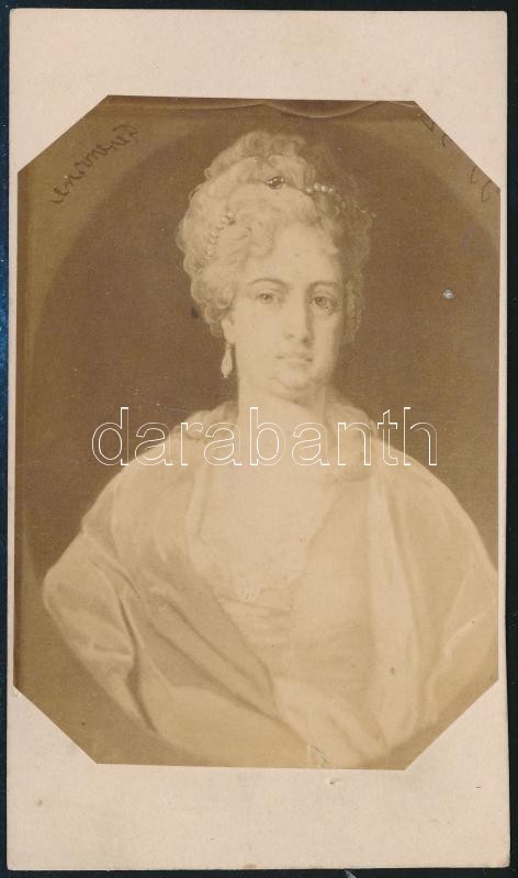 Leírás: Hessen-Wanfriedi Sarolta Amália hercegnő, II. Rákóczi Ferenc felesége, festményről készült fénynyomat, hátulján feliratozva, 10,5×6 cm