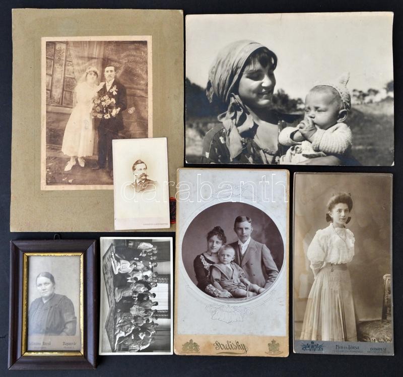 cca 1880-1929 Vegyes fotó tétel, 7 db, egy üvegezett fa keretben, közte egy Mai és Társa hölgyportréval, változó állapotban, a Mai fotó foltos, 8x13 cm és 17x24 cm közötti méretben