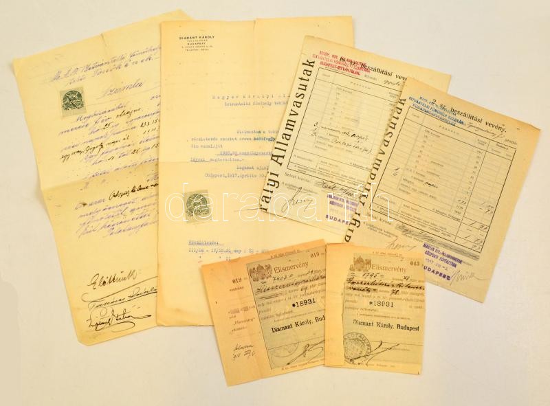1917 Diamant Károly vállalkozó hivatalos levele a MÁV Istvántelki Főműhelynek orosz hadifoglyok étkeztetése kapcsán, beszállítási vevénnyel, számlával, elismervényekkel, stb., összesen 6 db