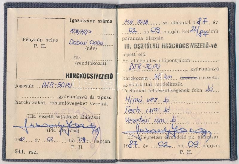 1987 Harckocsi és rohamlöveg vezetői igazolvány