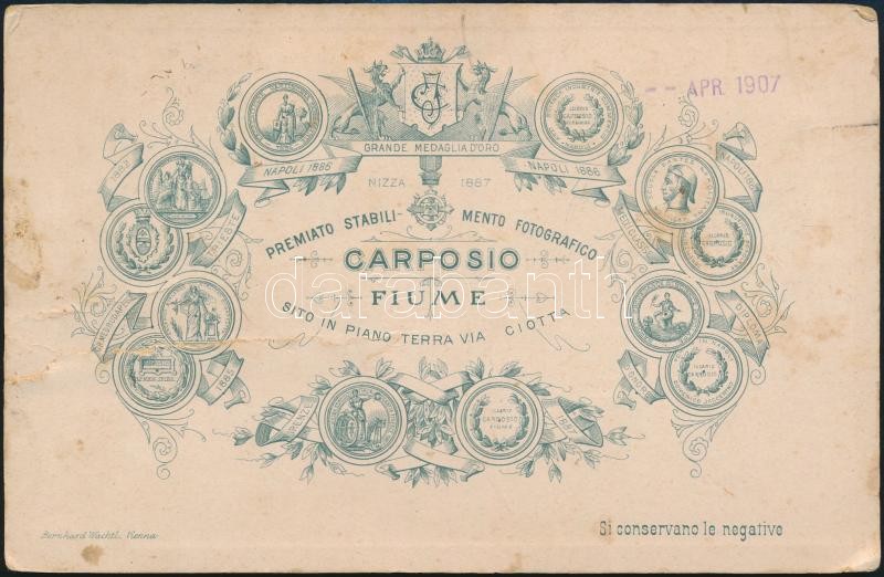 Leírás: cca 1907 Osztrák-magyar katonai tisztviselő műtermi fotója, Caprosio fiumei műterméből, kartonra kasírozva, 17x11 cm
