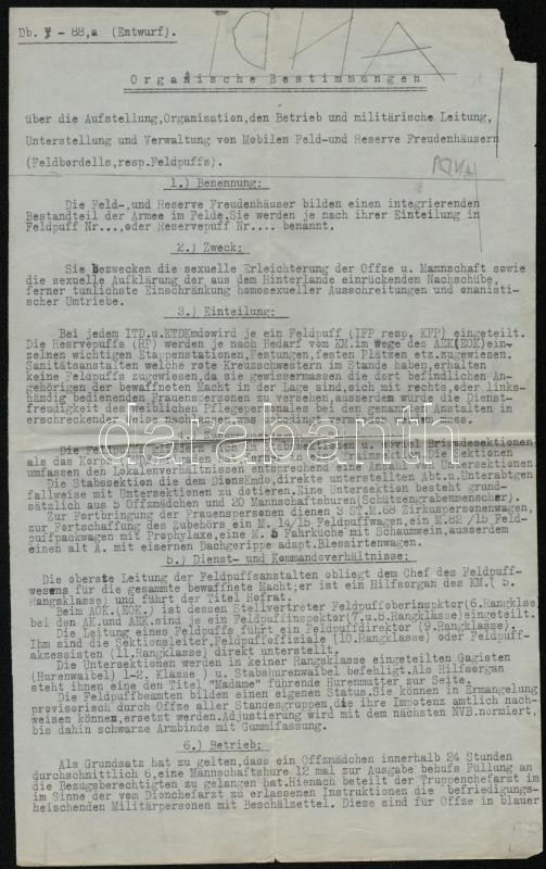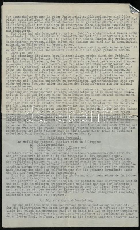 Leírás: cca 1914-1918 Katonai és tábori bordélyházakról szóló rendelkezési, szabályozási tervezet, német nyelven, 2,5 gépelt oldal