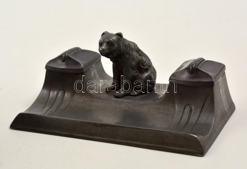 Leírás: cca 1900 Ón asztali toll tartó készlet medve figurával két üvegbetéttel 18 cm széles / Tin table kit