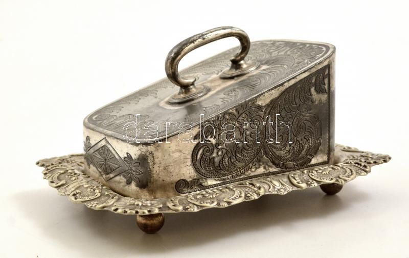 Leírás: cca 1900 William Briggs & Co sajttartó tálca és fedő, ezüstözött alpakka, jelzett, kopott, 24,5×19 cm