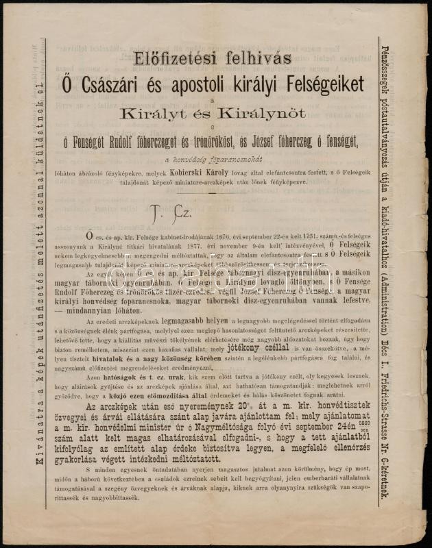 1877 Előfizetési felhívás I. Ferenc József császár és király, felesége Erzsébet császárnő és királynő, fiuk Rudolf trónörökös, és József főherceg elefántcsontra festett miniatűrök után készült fotóira, Bécs, Kobierski Károly fotóinak kiadó hivatala, magyar nyelven, a széleken kis szakadásokkal.