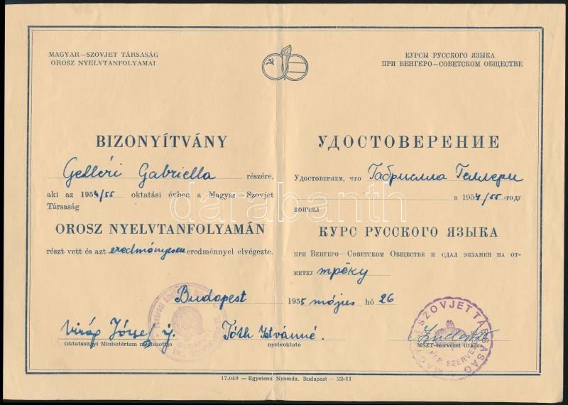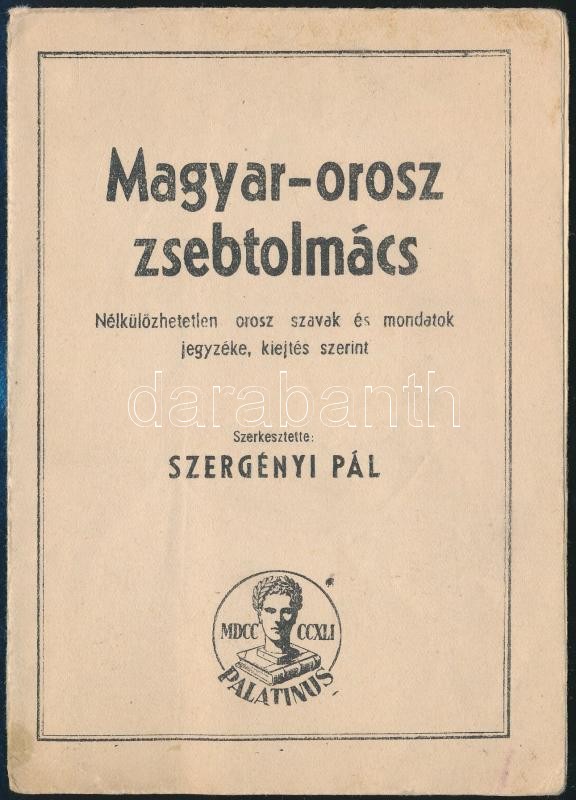 1941-1955 Magyar-orosz zsebtolmács. Nélkülözhetetlen orosz szavak és mondatok jegyzéke, kiejtés szerint. Szerk.: Szergényi Pál. Bp.,1941, Palatinus, 8 p. + Magyar-Szovjet Társaság orosz nyelvtanfolyamának bizonyítványa