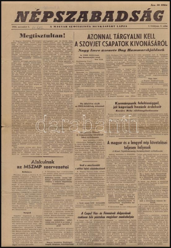 1956 Népszabadság. A Magyar Szocialista Munkáspárt Lapja. I. évf. 2 sz... https://www.darabanth.com/hu/336-Gyorsarveres/336.0/Mutargy-papirregiseg-egyeb/Nyomtatvanyok~500030/1956-Nepszabadsag-A-Magyar-Szocialista-Munkaspart-Lapja-I-evf-2-sz-1956-november-3-sza~II1867076
