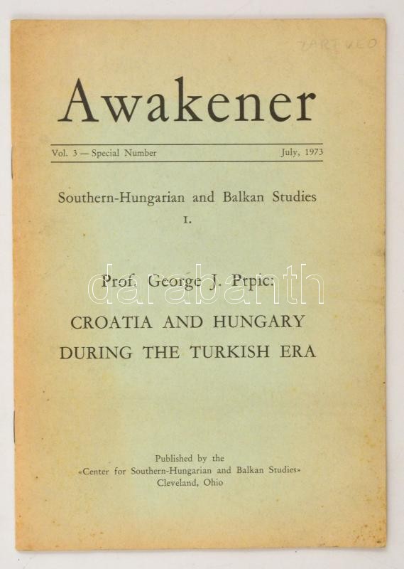 Leírás: 1973 Prpic, George J.: Croatia and Hungary during the Turkish era. Klny. az Awakener 3. számából, tűzött papírkötésben, 32 p.