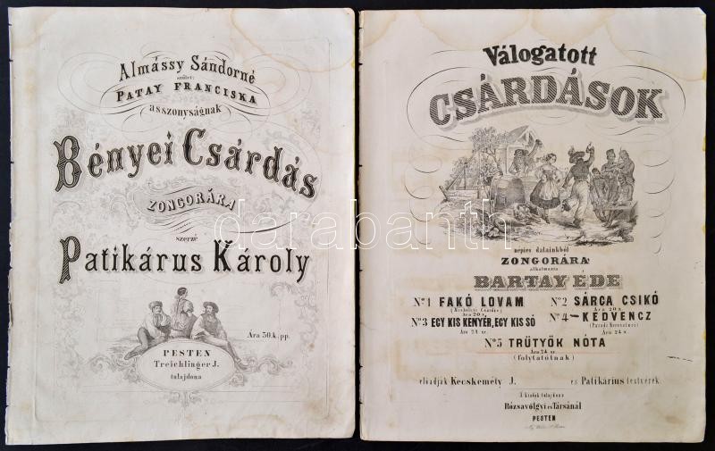 Bartay Ede: Válogatott csárdások népies zongorára alkalmazata: - -. Előadják Kecskeméty J., és Patikárius testvérek. Pest, é.n. Rózsavölgyi és Társa, 5 p. Foltosak.
