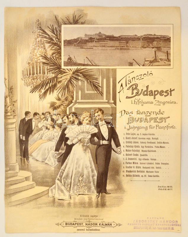 cca 1890-1900 A Táncoló Budapest I. évfolyamának illusztrált címlapja, rajta a budai várral és dunai palotasor panorámájával, litográfia, Budapest, Nádor Kálmán.