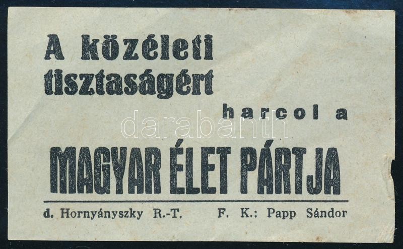 Leírás: cca 1939 A közéleti tisztaságért harcol a Magyar Élet Pártja, Magyar Élet Pártja címke, Bp., Hornyánszky-ny.,7x4 cm