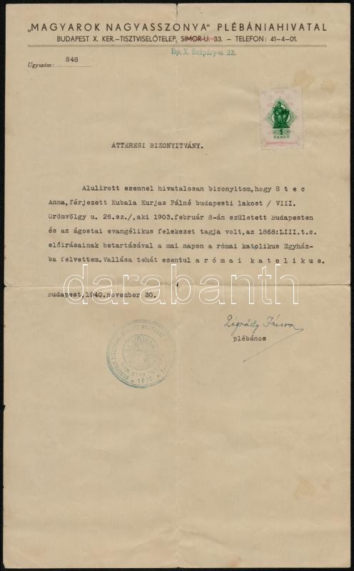 Leírás: 1940 Kubala László focista édesanyjának, Stec Annának áttérési bizonyítványa, okmánybélyeggel