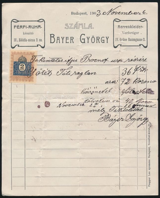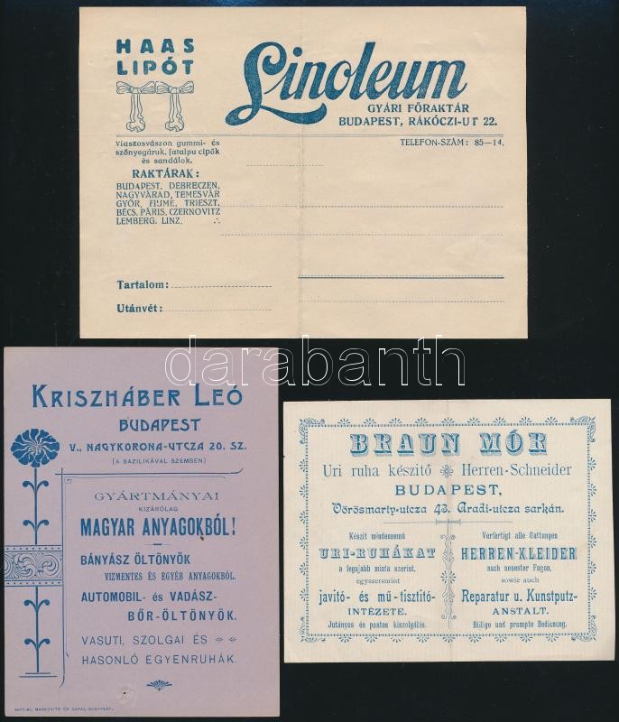 Leírás: Divatáruval kapcsolatos 4 db szórólap és számla (Haas Lipót, Kriszháber Leó, Braun Mór, Bayer György)