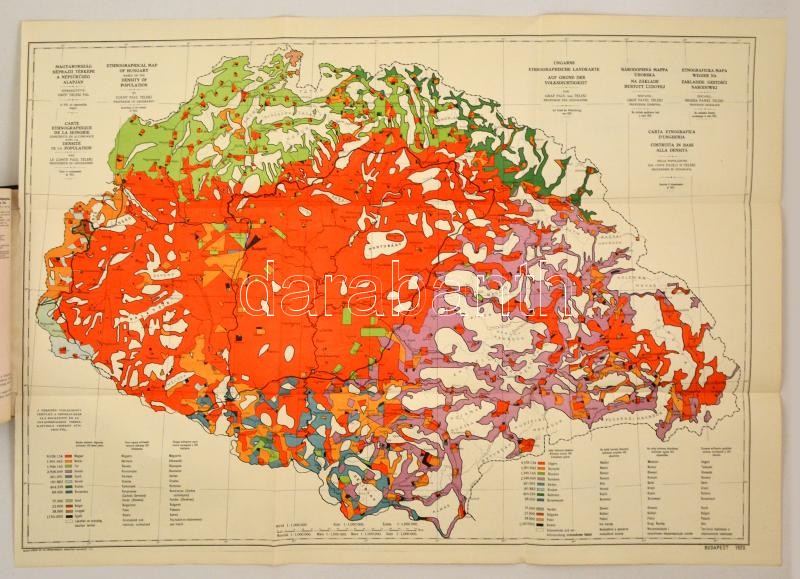 50. oldalnál: Magyarország néprajzi térképe, Szerk.: Teleki Pál, Bp. Klösz Gy. és fia, több nyelven, 63x87 cm. Ritka!