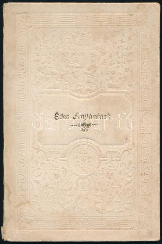 1934 Édes Anyámnak feliratú fényképtartó, belül irredenta felirattal ("Hiszek Magyarország Feltámadásában"), nemzeti kiscímeres, angyalos pajzstartókkal, nemzeti szalaggal, Bp., Vidor műterem, kissé foltos, kopott, a gerincen pici sérüléssel, fénykép: 7x5 cm, fényképtartó: 18x12 cm