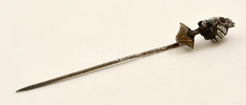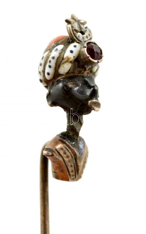 Leírás: Ezüst (Ag.) szerecsen fejes kitűző, köves berakással, jelzés nélkül, sérüléssel, br.: 3 g