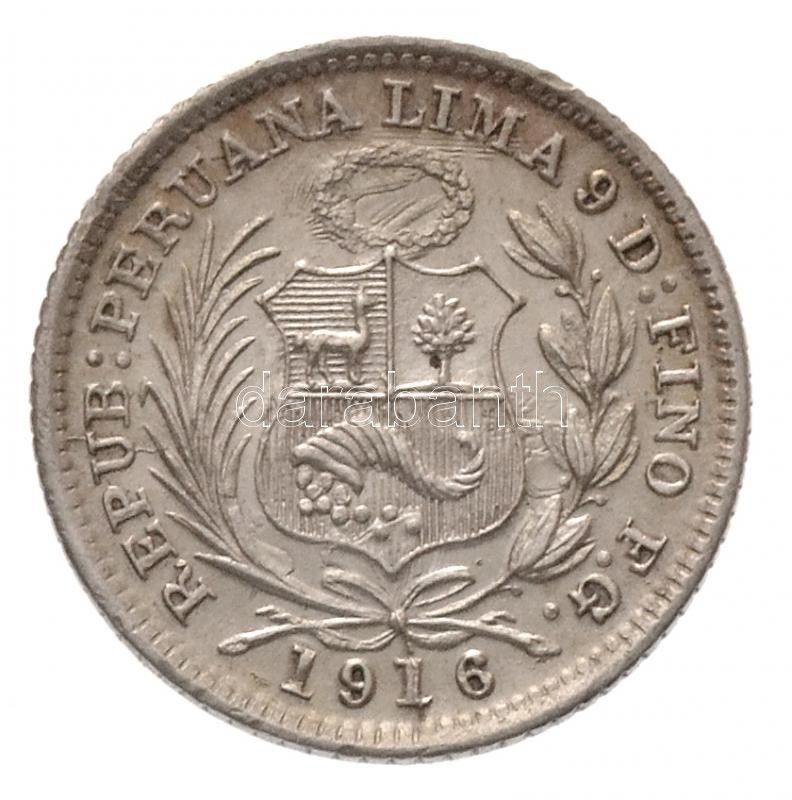 Krause KM#20... https://www.darabanth.com/hu/336-Gyorsarveres/336.0/Numizmatika/Kulfoldi-fem-es-ezustpenzek~1500013/Peru-1916FG-12D-Ag-T1--Peru-1916FG-12-Dinero-Ag-CAU-Krause-KM232062~II1884742