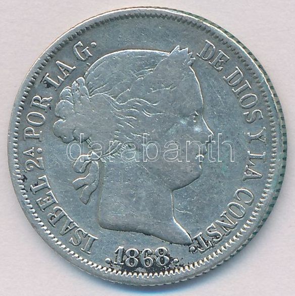Spai... https://www.darabanth.com/hu/336-Gyorsarveres/336.0/Numizmatika/Kulfoldi-fem-es-ezustpenzek~1500013/Spanyolorszag-1866-40c-Ag-II-Izabella-4-90g-T2--Spain-1866-40-Centimos-Ag-Isabell-II-4-~II1885632